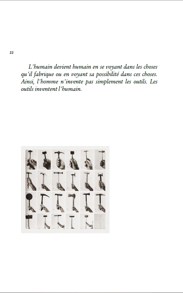 Un autre point à clarifier ici est que l’IA est un outil, de la même nature qu’un marteau. Comme le soulignent Beatriz Colomina et Mark Wigley en paraphrasant André Leroi-Gourhan « The human hand is human because of what it makes, not what it is. » La pensée technologique et l’amélioration de l’outillage humain, autant dire le « design » est propre à l’Homme.